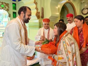 दर्शन के बाद पूर्व केन्द्रीय मंत्री स्मृति ईरानी मंदिर परिसर में लाल छत पर पहुंचीं| श्रीमती स्मृति ईरानी एवं एकता कपूर ने श्री विशाल बावा से आशीर्वाद लिया | श्री विशाल बावा ने मंदिर परंपरानुसार श्रीमती स्मृति ईरानी एवं एकता कपूर का रजाई, ऊपरना ओढ़ाकर एवं प्रसाद प्रदान कर समाधान किया