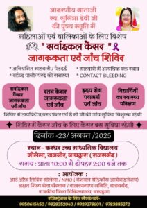 नाथद्वारा ( दिव्यशंखनाद ) 22 अगस्त | स्व.श्रीमती सुमित्रा देवी सनाढ्य की पुण्य स्मृति में दिनांक 23 अगस्त, शनिवार को प्रातः 10:00 बजे से दोपहर 2:00 बजे तक श्री करधर राजकीय उच्च माध्यमिक विद्यालय, मोलेला में एक विशाल निशुल्क चिकित्सा एवं सर्वाइकल कैंसर जागरूकता शिविर का आयोजन किया जा रहा है।