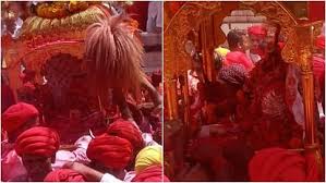 चारभुजा मंदिर में ठाकुर जी को पहले सोने के घड़े से स्नान करवाया गया इसके बाद उन्हें विशेष आभूषण पहनकर सुसर्जित किया गया| यह दिव्य श्रृंगार वर्ष में केवल दो बार ही होता है| ठाकुर जी चांदी की बंदूक और सोने के रथ में सवार होकर नगर भ्रमण के लिए निकलते हैं| जैसे ठाकुरजी नगर भ्रमण पर निकले भक्तों ने गुलाल उड़ाकर स्वागत किया। इस दौरान नगर की पूरी सड़कें गुलाल से लाल नजर आईं। बड़ी संख्या में पहुंचे श्रद्धालुओं ने ठाकुरजी के दर्शन किए। इस दौरान मंदिर में हाथी घोड़ा पालकी जय कन्हैया लालकी और छोगाला छेल के जयकारे सुनाई दिए।