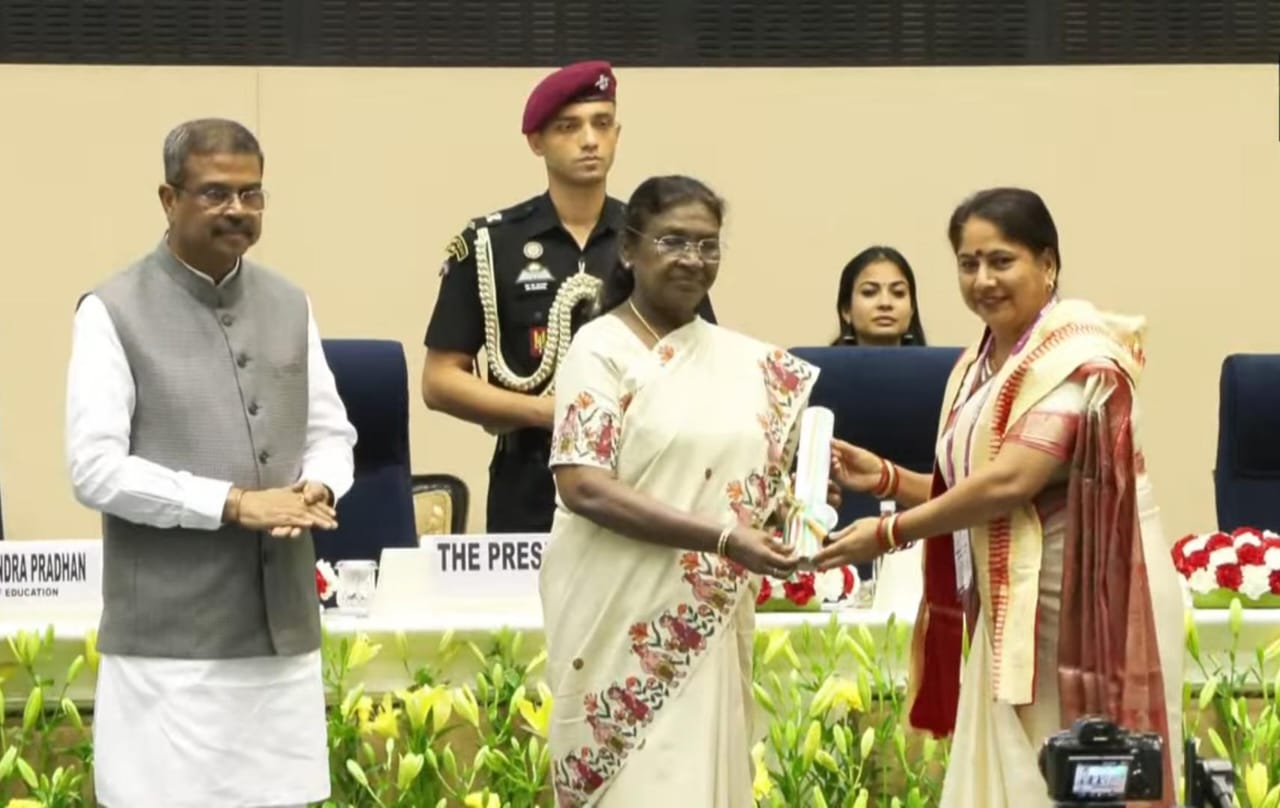जयपुर ( दिव्य शंखनाद ) ०5 सितंबर । नई दिल्ली के विज्ञान भवन में शुक्रवार को राष्ट्रीय शिक्षक दिवस के अवसर पर आयोजित भव्य सम्मान समारोह में राष्ट्रपति श्रीमती द्रौपदी मुर्मू ने देशभर से चयनित 45 उत्कृष्ट शिक्षकों को राष्ट्रीय शिक्षक पुरस्कार से सम्मानित किया। समारोह में राजस्थान के राजकीय बालिका उच्च माध्यमिक विद्यालय टपूकड़ा, अलवर की प्रिंसिपल श्रीमती नीलम यादव को भी राष्ट्रीय शिक्षक पुरस्कार से सम्मानित किया गया। प्रतिवर्ष राष्ट्रीय स्तर पर दिए जाने वाले इन पुरस्कारों का उद्देश्य शिक्षा के क्षेत्र में उत्कृष्ट कार्य करने वाले शिक्षकों को उनकी पहचान और सम्मान दिलाने के साथ-साथ अन्य शिक्षकों को प्रेरित करने का भी होता है ताकि शिक्षा की गुणवत्ता में सुधार के साथ-साथ विद्यार्थियों के समग्र विकास में शिक्षक और अधिक योगदान देने की प्रेरणा ले सकें।