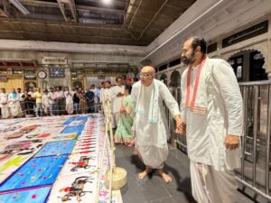 नाथद्वारा ( दिव्यशंखनाद ) 22 सितम्बर | पुष्टीमार्गीय प्रधान पीठ प्रभु श्रीनाथ जी की हवेली के तिलकायत श्री गो.ति.108 श्री राकेश जी (श्री इंद्रदमन जी) महाराज श्री व उनके सुपुत्र युवाचार्य गो.चि.105 श्री विशाल जी (श्री भूपेश कुमार जी) बावा श्री के वल्लभ कुल परिवार सहित दि. 20/09/2025,शनिवार आश्विन कृष्ण पक्ष चतुर्दशी को श्रीजी प्रभु के दान लीला एव सांझी के कोट की सेवा में नाथद्वारा पधारने के अवसर पर श्री लाडले लाल प्रभु के बगीचे में प्रथम बार शनिवार चतुर्दशी को आरती दर्शन में जल की सांझी के मनोरथ का भव्य मनोरथ किया गया।