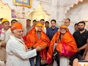 नाथद्वारा ( दिव्यशंखनाद ) 13 नवंबर | राम कथा वाचक राष्ट्रीय संत मुरारी बापू ने गुरुवार को श्रीजी प्रभु की राजभोग झांकी के दर्शन किए | दर्शन के बाद संत मुरारी बापू का मंदिर में समाधान किया गया । बापू के साथ समाजसेवी व मिराज समूह के चैयरमेन मदनलाल पालीवाल, प्रमोद पालीवाल, प्रकाश पालीवाल, रविन्द्र जोशी ने भी श्रीनाथजी के दर्शन किए ।